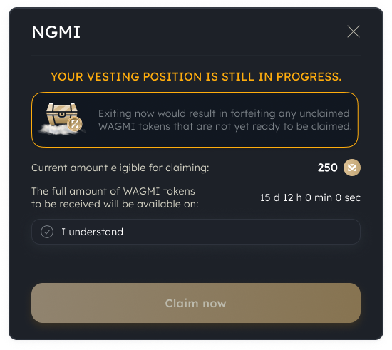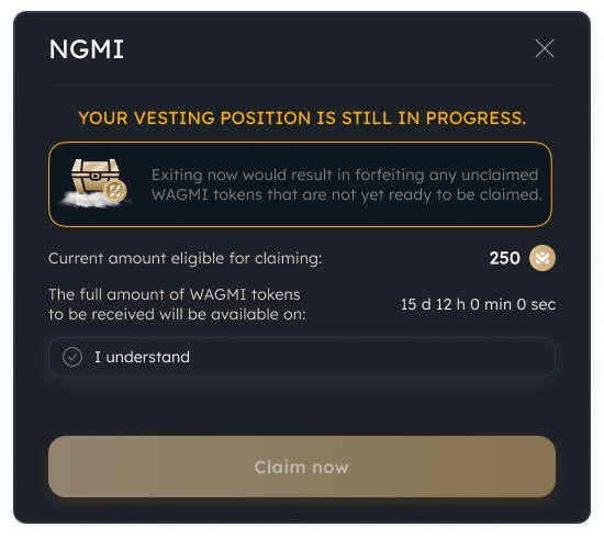 If you exit early, you will lose all WAGMI tokens that have not yet vested.